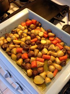 - In a large bowl, toss potatoes, mushrooms, and carrots with the marinade. Season with salt and pepper. If it seems too dry, add a little extra olive oil, making sure all the pieces are completely coated. Place on a rimmed baking sheet or in a large casserole dish that has been sprayed with cooking spray or lightly oiled.